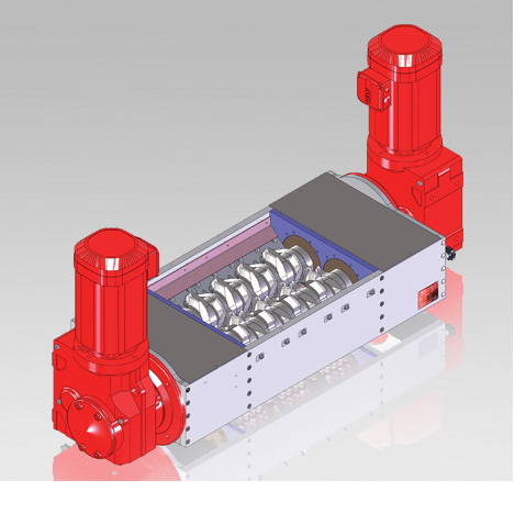Die Zerkleinerer in dieser verstärkten Ausführung wurden optimiert für die Zerkleinerung von extrem hohen Metallspänemengen und besonders zähes und festes Material. Durch die Bauweise mit zwei Motoren, jeder Motor treibt eine Welle an, kann eine noch höhere Ausfallsicherheit gewährleistet werden. Die kompakte Bauweise ermöglicht Ausführungen in Einwellen-, Zweiwellen- und Mehrwellentechnologie. Als Mehrwellenlösung sind sie besonders geeignet für die manuelle Späneaufgabe über Spänebehälter.
